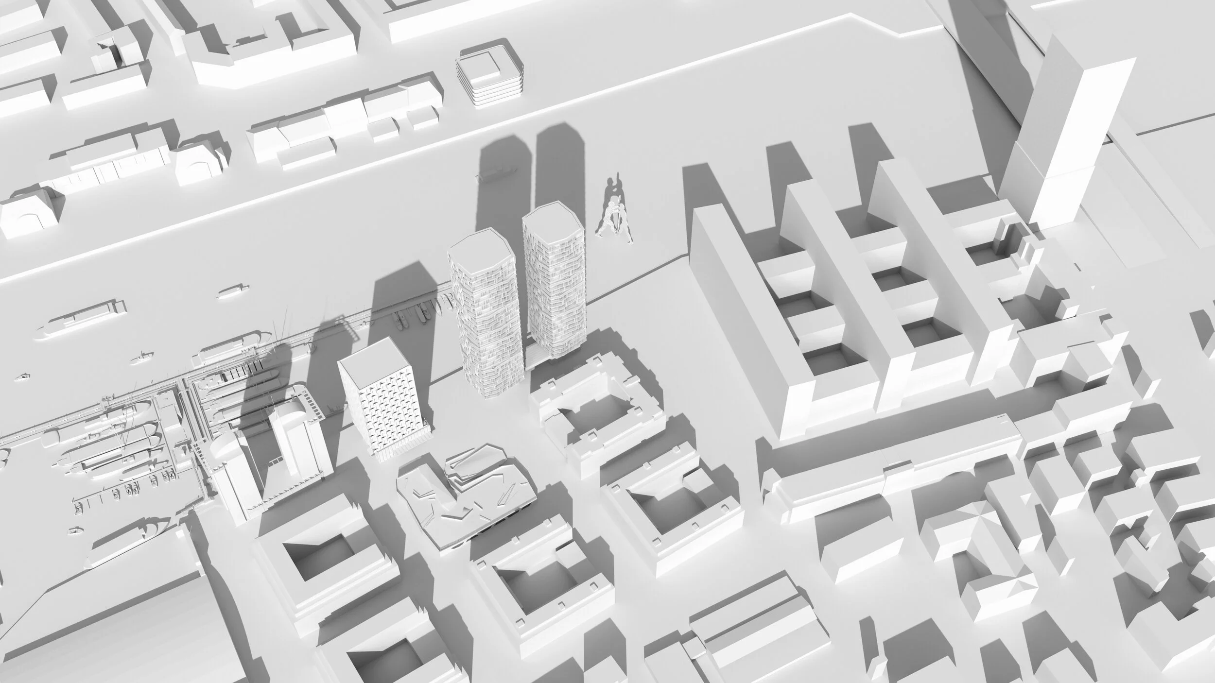 Komprimierung der Flächen in die Höhe zugunsten von öffentlichen Freiräumen und Minimierung der Grundfläche durch drei Punkthochhäuser entlang der Spree